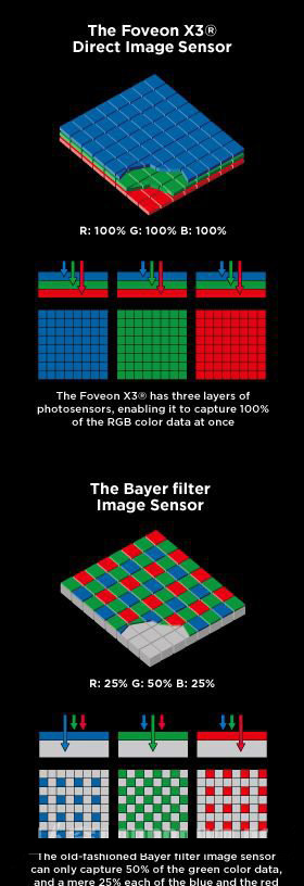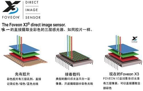 适马的 X3 传感器与传统拜耳阵列传感器结构完全不同,传统的拜耳阵列传感器为一层的 RGBG 滤片设计,而适马的 X3 则是与胶卷的三层结构设计类似,在传感器上方铺满 BGR 三层像素叠加而成,就像是胶卷上面的三层乳剂一样,只不过胶卷是没有像素点这种东西的。X3 感光元件的每一个像素都能够感应到 RGB 三种色彩,从而在同一个像素上就完成了色彩的匹配数据,而且不再需要像拜耳阵列一样使用了 “猜色”(反马赛克运算) 技术才能填上临近像素的色彩。由于直接省略了 “猜色” 的过程,所以适马 X3 对于像素色彩之间干扰就等于没有了,而且对于色彩的还原准确性来说会更好一些。然而也因为使用了三块像素滤片叠加的原因,对于光线的衰减也是一个问题,特别是在最底层的红色像素滤片会比较吃亏,不过从众网友拍摄直出的色彩来说好像问题也并不大,而且很多人在拍摄之后会选择后期处理,色彩的调校就看你自己的喜好了。