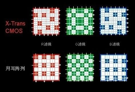 另一种就是富士开发的 X - Trans 传感器,它与基于传统的拜耳阵列传感器上革新的传感器,传统拜耳传感器为 2 2 的 RGBG 排列,而 X - Trans 传感器则是以 6 6 的像素排列。其中 X - Trans传感器的 RGB 像素滤片排列顺序是从胶片的银盐颗粒无序性上得到的启发,对传感器的色彩滤镜阵列进行修改,添加了模拟的无序性排列。说是无序性,其实还是不能看出一定的规则顺序的,只不过 6 6 这种大间隔有规则方向排列的重复频率相比起拜耳阵列确实要小得多,所以这种阵列方式也能够在很大程度上减轻了摩尔纹的产生。而 X - Trans 传感器当中绿色的滤片会比较多些,官方说法是人眼对绿色最敏感,所以增加多点绿色,让色彩更真实一些(就是更艳丽,更贴合人眼观感)。